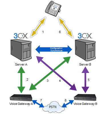 负载均衡模式中,一半的使用者注册在Server A,另一半的使用者注册在Server B,用来处理打出的电话。打入的电话会平均派到Gateway A 同 B,例如第一个call会派往A,而下一个便派往B,如此类推;gateway A 的call便会途经2,而gateway B的call便会途经5。 这个模式可以与Full Redundancy一同使用。 注意:电讯供应商也要配合适当的设定。